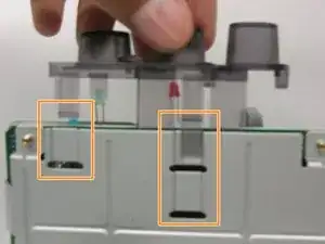 Удерживайте защёлку в нажатом положении, зацепив инструментом между защёлкой и отверстием. Потяните корпус вверх, чтобы защёлка не вернулась на своё место.