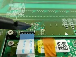 Тяните за белую пластиковую вкладку, чтобы отключить плоский провод.