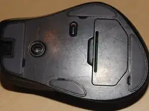 Начните с выключения мыши и снятия задней крышки батарейного отсека и самой батареи.