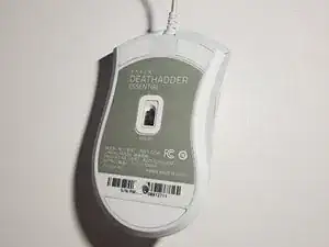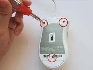 Проколите отверстие в центре штрих-кода, чтобы получить доступ к трём винтам, скрепляющим корпус мыши.