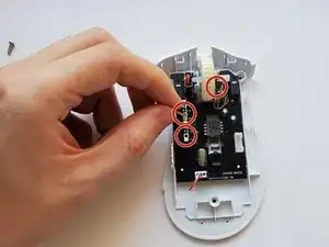 Разъедините корпус мыши и открутите отвёрткой Phillips #1 два винта длиной 11 мм, расположенных с левой стороны платы.