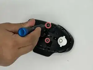 Переверните мышь и аккуратно снимите наклейку.