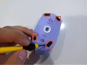 Используйте отвёртку с плоским лезвием 1.5 мм, чтобы снять четыре коврика с основания мыши.