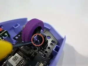 Существует металлическая пружина, которая удерживает одну сторону колеса прокрутки, удалите металлическую пружину с помощью отвёртки с плоским лезвием 1.5 мм, поднимая колесо прокрутки.