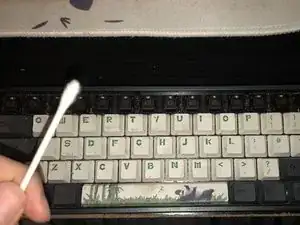 Смочите ватную палочку водой и пройдитесь ею между клавишами, чтобы собрать мусор.