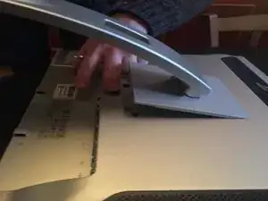 Передняя панель теперь полностью отщёлкнута; положите экран (стеклом вниз) на стол, следя, чтобы передняя панель не защёлкнулась снова, затем снимите подставку/ножку с экрана.
