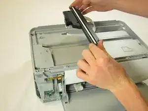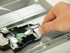 Внутри принтера находится маленький белый язычок. Надавите на него медиатором, пока не услышите щелчок.