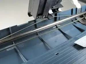 Снимите головку сканера с лотка сканера, подняв головку сканера вверх и оттянув чёрную защёлку от серого приводного ремня.