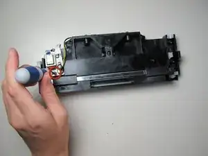 Удалите маленький серебристый винт в панели управления головки сканера.