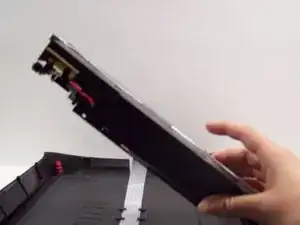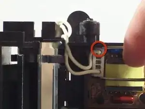 Поднимите чёрный пластиковый держатель, к которому прикреплена лампа, с левой стороны до перпендикулярного положения относительно нижней крышки сканера.