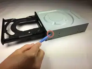 Вставьте скрепку в небольшое отверстие на правой стороне лицевой панели под лотком диска.