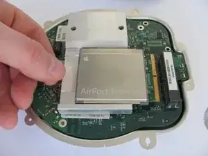 Поднимите и отделите верхнюю и нижнюю части металлического корпуса. Вы теперь увидите материнскую плату и карту AirPort.