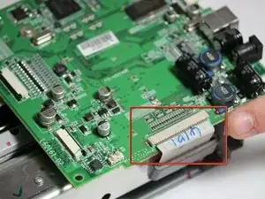 Материнская плата изменила ориентацию. Обратите внимание на новую ориентацию, исходя из белого ленточного кабеля, отключённого на предыдущем шаге.