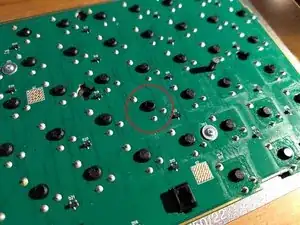 Найдите и отметьте заднюю часть неисправной клавиши. Каждая клавиша соединена с печатной платой в трёх точках пайки. Черный контакт просто вставлен и не соединен с печатной платой.