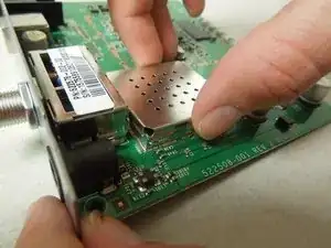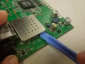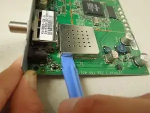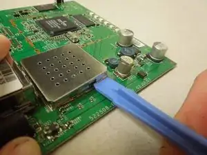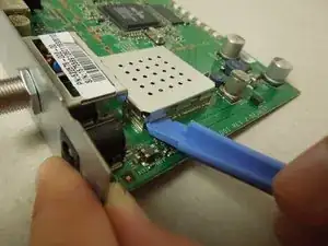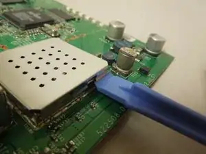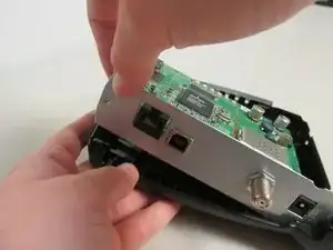 После открытия маршрутизатора возьмитесь за верхний левый угол серебристой лицевой панели и аккуратно вытяните материнскую плату из гнезда внутри корпуса.