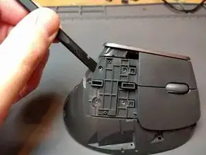 Вставьте пластиковую лопатку в шов между резиновой панелью и пластиковой основой мыши с её правой стороны. Панель должна почти полностью отщелкнуться.