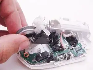 Снимите зажим, удерживающий полупрозрачный узел колёсика прокрутки с чёрной пластиковый деталью