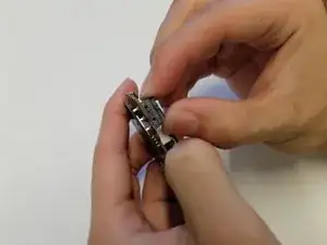 Снимите фиксатор обратной связи колёсика прокрутки с колеса, удерживая пружину и используя угловые пинцеты для извлечения с посадочного места.