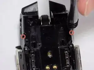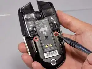 Используйте крестовую отвертку Phillips #00, чтобы ослабить два закрученных винта на нижней стороне мыши.