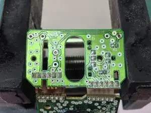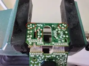 После освобождения платы определите три микровыключателя — для колеса прокрутки и по одному для левой и правой кнопок. Закрепите плату в небольших тисках или держателе для плат.