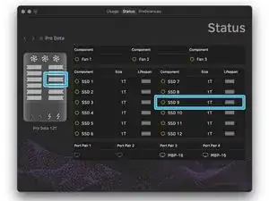 После сборки шасси, следуя инструкциям в этом руководстве в обратном порядке, убедитесь, что новый модуль SSD распознается и в порядке, запустив iodyne из папки «Программы» и перейдя на вкладку «Статус».