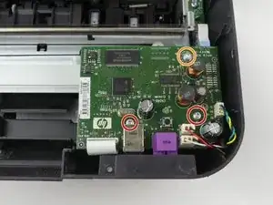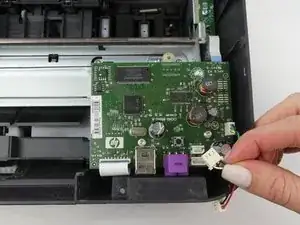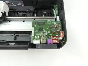 Найдите и отсоедините три разноцветных проводных разъема, которые соединяют плату с другими компонентами принтера.
