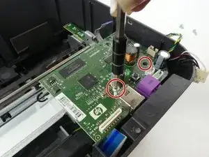 Удалите два винта 13 мм, расположенные на задней панели принтера, используя отвертку с торкс-насадкой T10 (звездообразная).