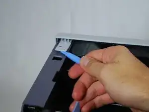 Используйте пластиковый инструмент для вскрытия, чтобы аккуратно приподнять одну сторону верхней панели с её штыря.