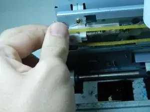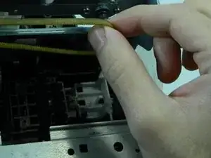 Чтобы ослабить ремень синхронизации CR (жёлтый), сначала используйте крестовую отвертку PH #1, чтобы ослабить винт, удерживающий «держатель стопора шкива» на месте.