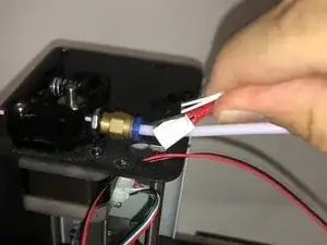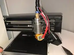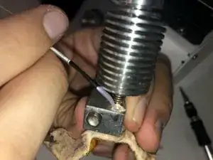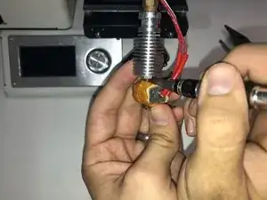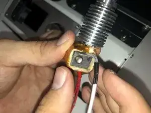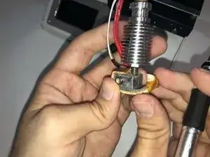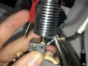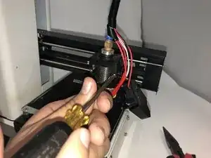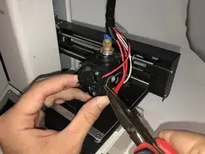 Используйте плоскогубцы с удлинёнными носиками, чтобы снять две пружинные скобы по обе стороны кожуха, закрывающего хотенд.