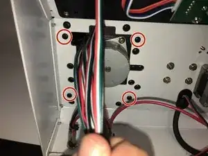 Удалите четыре винта с крестообразным шлицем, удерживающие вертикальную секцию принтера на основании.
