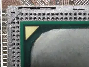 Поместите старый процессор в антистатический контейнер, убедитесь, что ваш антистатический ремешок подключён. Достаньте новый процессор из антистатического контейнера и аккуратно установите его в разъём. Как процессор, так и разъём отмечены треугольником для ориентирования при установке.