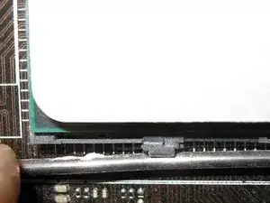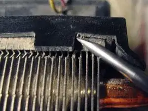 Блок вентилятора удерживался четырьмя пластиковыми защёлками. Очень аккуратно используйте плоскую отвертку, чтобы слегка приподнять защёлку и подать блок вверх, повторяйте, пока блок вентилятора не отойдёт.