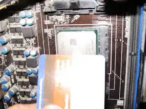 Нанесите каплю термопасты на процессор и разровняйте пластиковой картой или подобным инструментом. Термопаста должна быть распределена тонким, равномерным слоем. Я установил радиатор и немного пошевелил его, чтобы дополнительно выровнять термопасту.