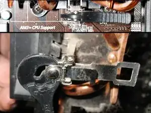 Вы увидите процессор, как показано. Он зафиксирован в разъёме AM3+ двумя защёлками. На левой части первой фотографии видно рычажок — поднимите этот рычажок до упора в обратное положение. Это снимет напряжение с фиксирующего механизма, что позволит отсоединить сначала одну сторону от зацепа, затем другую.