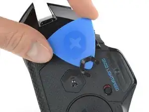 Вставьте кончик медиатора для вскрытия под переднюю точку ножки у сенсора. Держите медиатор под крутым углом относительно мыши, чтобы попасть под клей ножки.