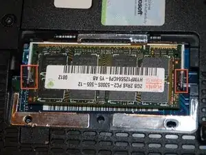 Нажмите на два металлических зажима с обеих сторон DIMM, чтобы модуль памяти выскочил.