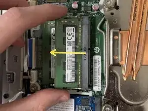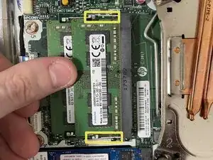 Чтобы установить новый модуль памяти, поместите модуль в слот под тем же углом, под которым вы его вытащили. Он должен легко встать на место, если угол правильный.
