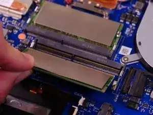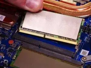 Отогните черную крышку, чтобы получить доступ к слотам. С каждой стороны каждой плашки памяти есть металлическая планка. Аккуратно отодвиньте оба уха планки, и SO-DIMM немного поднимется. Удалите плашку памяти, потянув за нее уверенно, но аккуратно. Она должна легко выйти. Используйте равномерное давление, а не резкие рывки.
