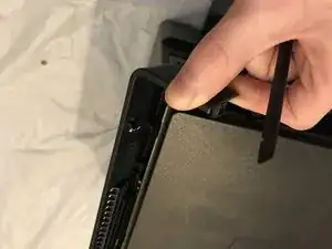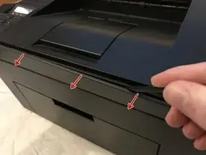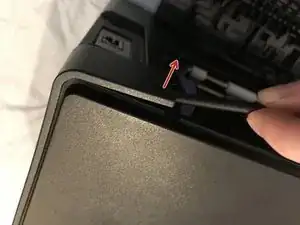 Вставьте инструмент для поддевания между передней полосой и верхней крышкой принтера, и подденьте вперед, чтобы освободить зажимы, удерживающие верхний край на месте.