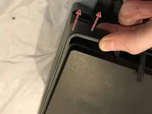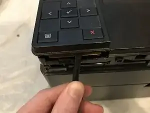 Отсоедините задний конец пластикового отделки, поддевая от задней панели принтера.