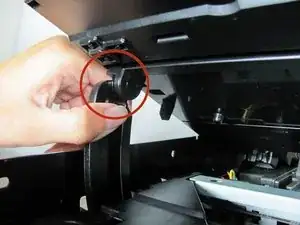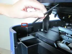 Снимите пластиковую крышку, нажав на защёлку, расположенную на правой стороне принтера. Вдавите защёлку внутрь до щелчка, затем поднимите крышку вверх и снимите её с принтера.