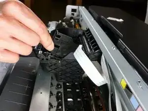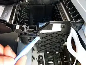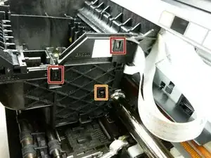 Пинцетом отожмите правую защёлку от задней правой панели каретки.