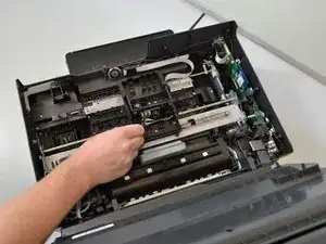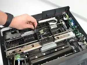 Поднимите печатающую головку с принтера, чтобы открыть доступ к последнему белому кабелю.