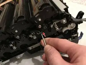 Используйте монтажный инструмент или маленькую плоскую отвертку, чтобы поддеть фиксирующий зажим на любом конце блока тандемного вала тонера, затем снимите вал с узла печати.
