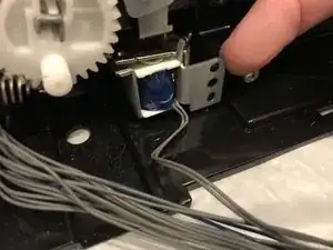 Снимите кронштейн соленоида, сорвав его с монтажных штырей, и удалите из принтера.