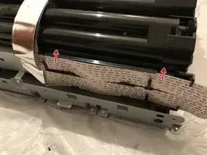 Вытащите плоские гибкие кабели, если они мешают доступу к снимаемому блоку тандемного вала тонера.