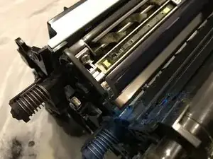Оттяните внутреннюю крышку отсека тонера от принтера, аккуратно поднимая крышку над пружинами, проходящими через неё (в противном случае они могут уронить дополнительный тонер), чтобы снять сборку внутренней крышки отсека тонера.