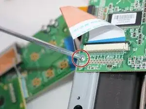 Выверните фланцевый винт Philips с печатной платы, расположенный непосредственно под широким плоским кабелем, соединяющим обе платы.