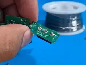 После очистки остатков паяльного флюса установите и припаивайте новый переключатель на плату. Повторите шаги 19 и 20 для другого переключателя.
